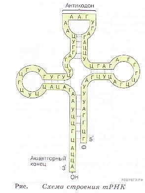 Все известные тРНК за счет комплементарного взаимодействия образуют вторичную структуру, по форме напоминающую лист клевера. В молекуле тРНК есть два активных участка: триплет-антикодон на одном конце и акцепторный конец на другом (рис).