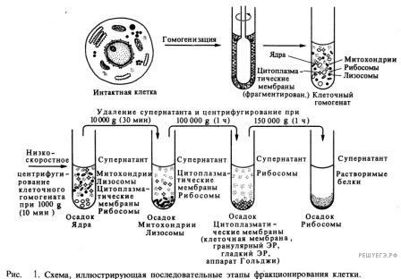 При центрифугировании содержащиеся в гомогенате органеллы располагаются в центрифужной пробирке на тех уровнях, на которых находятся растворы сахарозы, соответствующие им по плотности. Этот метод дает биохимикам возможность разделять органеллы одинаковых размеров, но разной плотности (рис. 1.).