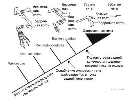 Тазовый пояс исчез вместе с задними конечностями; единственными остатками костей таза являются две небольшие кости, скрытые в мускулатуре и лежащие параллельно с осью тела. Лишь у немногих китов существуют еще маленькие рудименты бедренных костей. Причем у одного и того же вида степень их рудиментации колеблется.