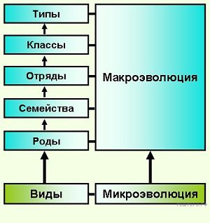 Микроэволюционный процесс: формируются новые виды; изменяет генофонд популяции; прогресс достигается путём частых приспособлений. Макроэволюционный процесс: формируются надвидовые таксоны; прогресс достигается путём ароморфозов или дегенерации.