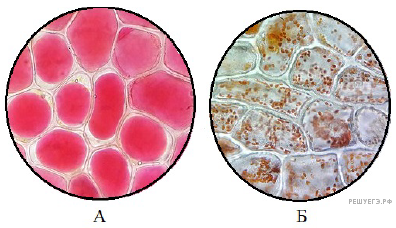 Экспериментатор изучал свойства пигментов плодов растений А и Б. Исследователь добавлял экстракты пигментов в пробирки с различным уровнем кислотности. Он обнаружил, что при повышении рН раствора цвет пигментов растения А меняется на синий, тогда как цвет пигментов растения Б не изменяется. При закислении цвет пигментов обоих растений не изменяется. Какой параметр задаётся экспериментатором (независимая переменная), а какой параметр меняется в зависимости от этого (зависимая переменная)? Какие группы пигментов отвечают за окрашивание плодов растений А и Б? Изучая клетки под микроскопом, исследователь увидел, что пигмент распределён в клетках по-разному (изображено на рисунке). Объясните, почему под микроскопом наблюдается принципиально различное распределение пигментов. Пигмент какого растения подойдёт для окрашивания водных растворов, а какого — для окрашивания жиров?