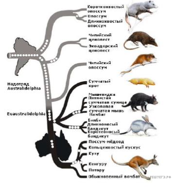 3. На той части суши, которая образовала Южную Америку и Австралию, сумчатые оказались в изоляции от предков плацентарных млекопитающих (не были вытеснены ими).