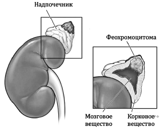 Феохромоцитома — это опухоль мозгового вещества надпочечников, клетки которой производят избыточное количество гормона.