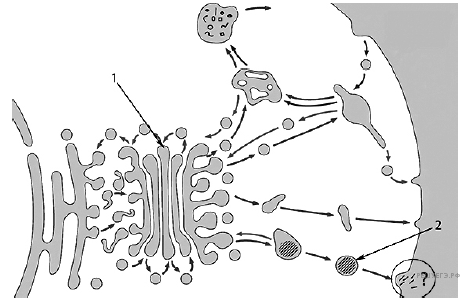 На рисунке изображена схема везикулярной системы клетки. Какому царству эукариот наиболее вероятно принадлежит данная клетка? Обоснуйте свой ответ. Назовите структуры, обозначенные цифрами 1 и 2. Опишите их функцию в процессе, обозначенном вопросительным знаком.