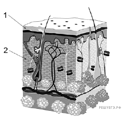 Установите соответствие между характеристиками и слоями кожи, обозначенными на рисунке цифрами 1 и 2: к каждой позиции, данной в первом столбце, подберите соответствующую позицию из второго столбца.