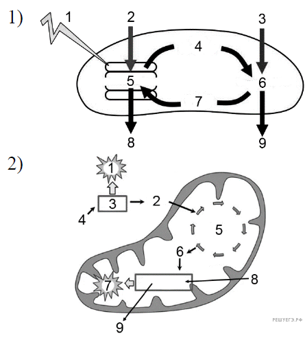 Установите соответствие между изображёнными ниже характеристиками и органоидами, обозначенными цифрами 1 и 2: к каждой позиции, данной в первом столбце, подберите соответствующую позицию из второго столбца.